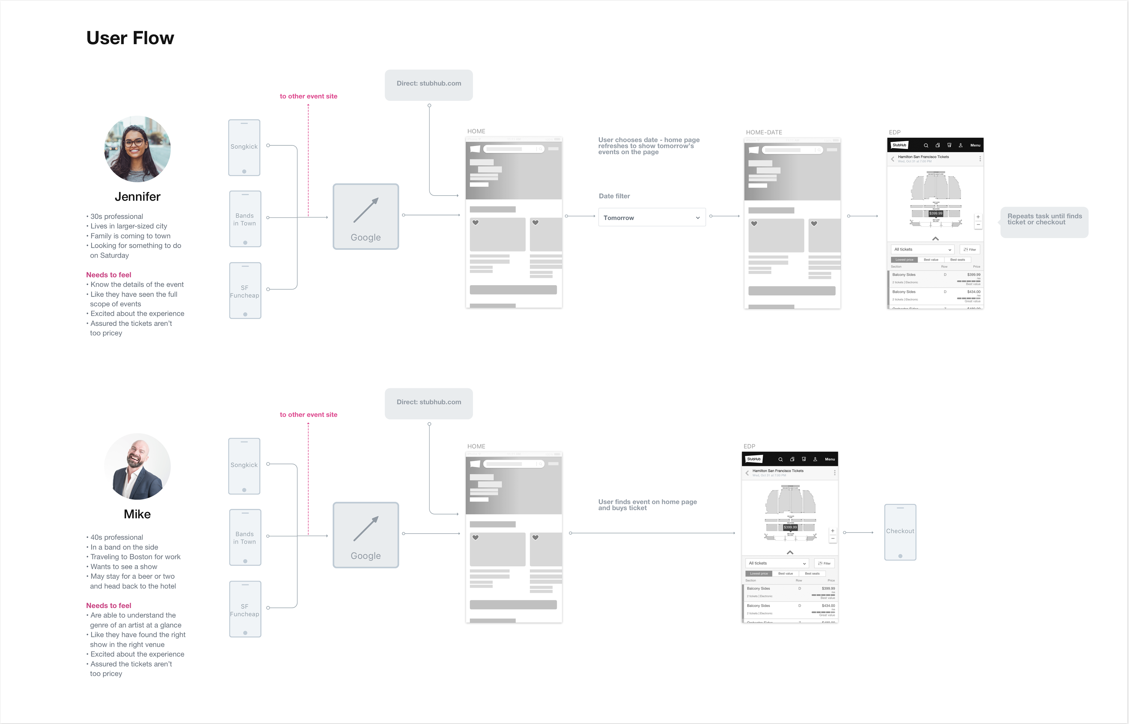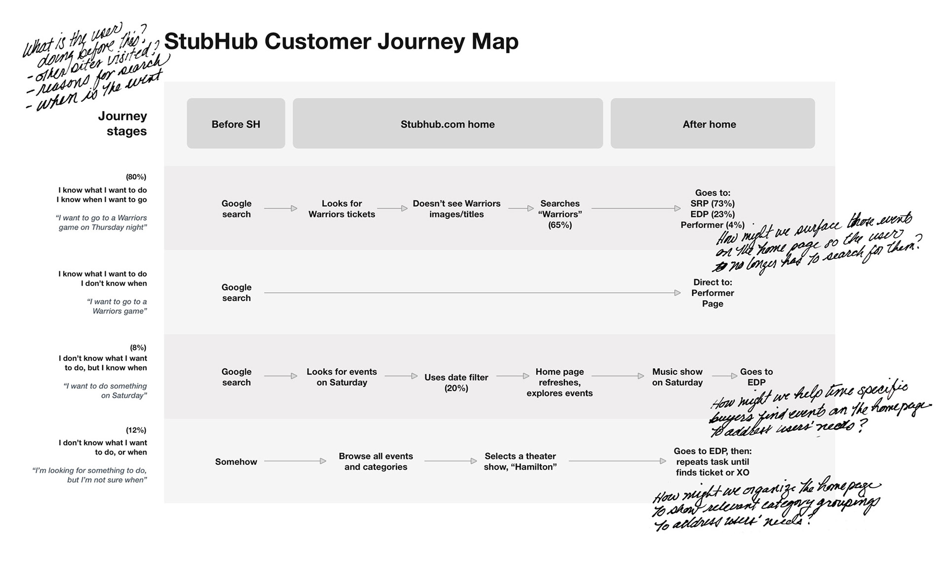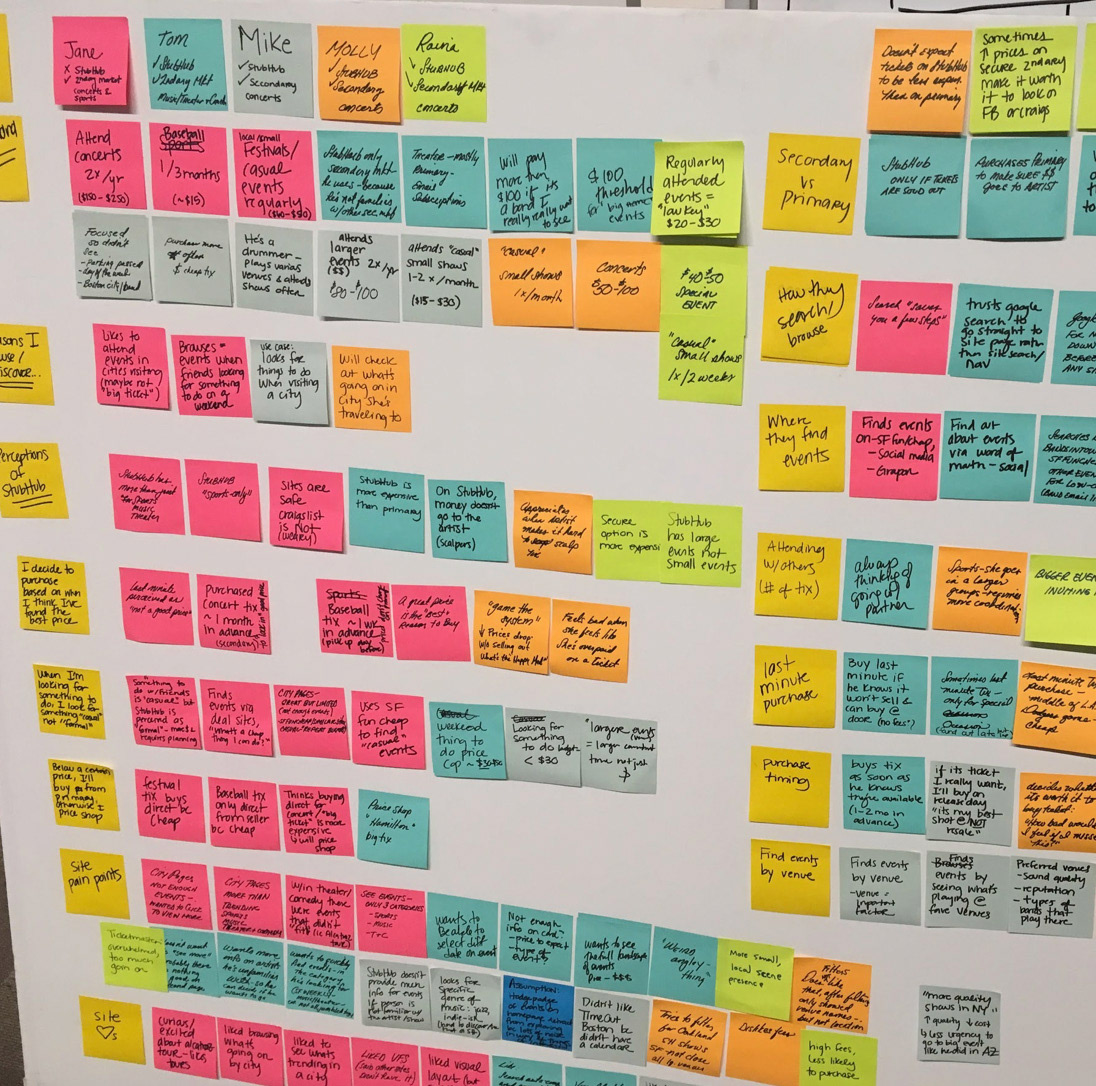The research surfaced several patterns and themes, and we generated many insight statements that gave us a wider view of the user journey and the opportunities for StubHub to address unmet user need and desires.